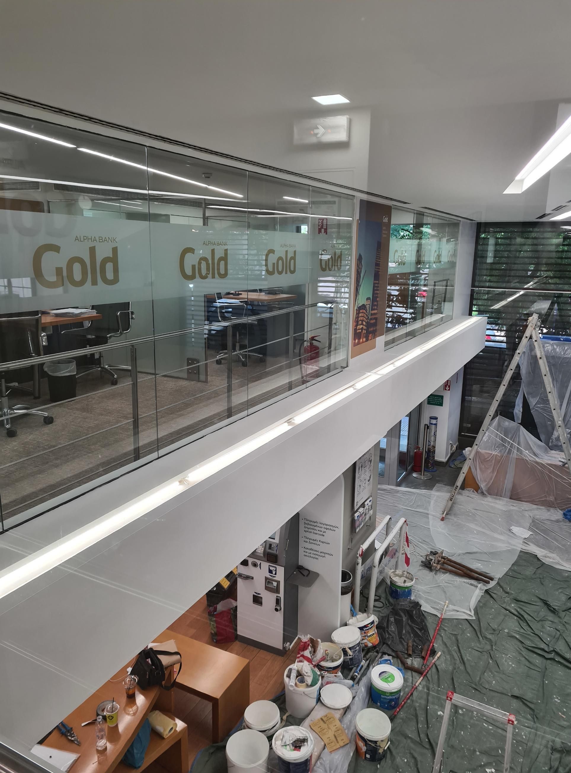 Οι εργασίες έγιναν σε όλες τις στάθμες του καταστήματος, ενώ τα νέα φωτιστικά σώματα LED τοποθετήθηκαν υπό νέα διάταξη σύμφωνα με τη μελέτη.